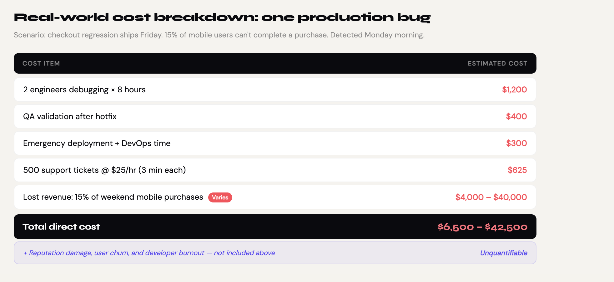 A bug in production isn't just a technical problem. It's a business problem with a price tag that compounds with every hour it goes undetected: lost revenue, lost users, lost engineer focus, and sometimes lost trust that never fully comes back.